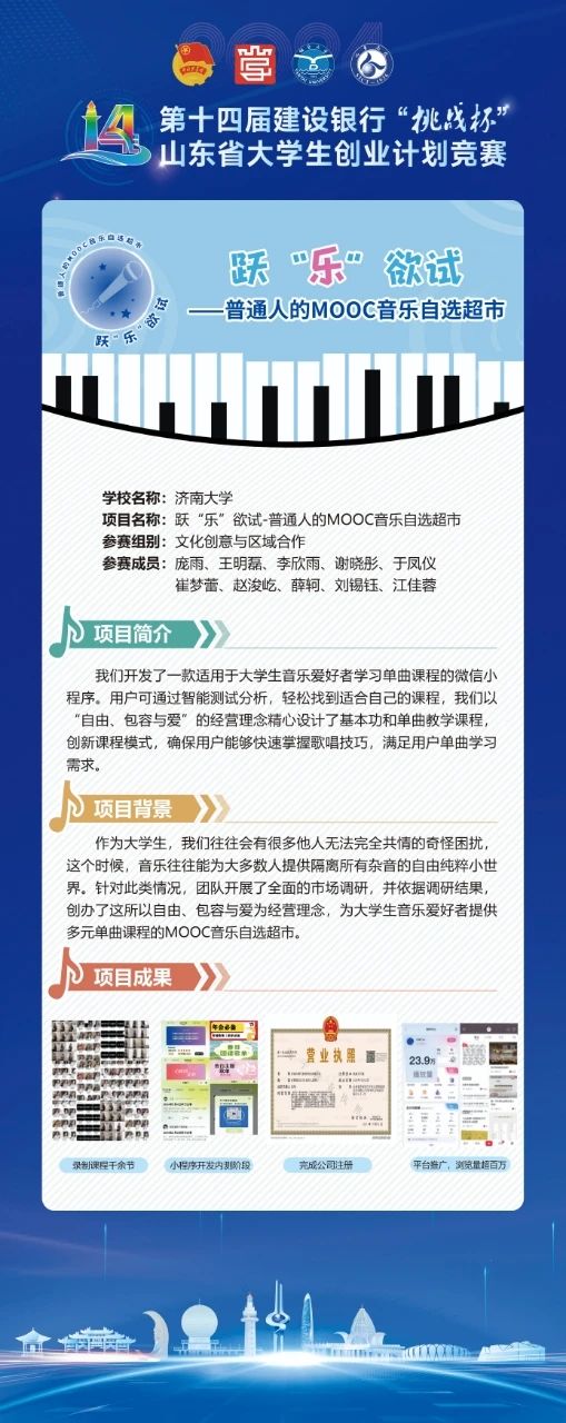 教师张爽婷、宋莉璐指导,学生庞雨、王明磊、李欣雨、谢晓彤、崔梦蕾、于凤仪、赵浚屹、薛轲、刘锡钰、江佳蓉完成的《跃“乐”欲试——普通人的MOOC音乐自选超市》项目斩获主赛道全国铜奖,创造了性爱电影