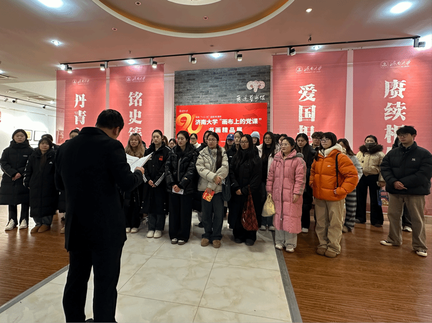 本次“画布上的党课”书画精品展以“丹青红韵、铭史铸魂、爱国担当、赓续相传”为主题,分为“山河危局·历史回响”“精神永续·青春向上”“砥砺奋进·自信自强”三个单元,集中展出来自全校师生创作的中国画、油画、版画、书法篆刻等百余件精品力作。在展览现场,同学们在一幅幅作品前驻足凝视、认真聆听讲解。“山河危局·历史回响”单元中,生动再现“一二·九”运动时期青年学子走上街头、振臂高呼的历史场景的画作,让大家深刻感受到90年前民族危殆之际,青年一代“华北之大,已安放不得一张平静的书桌”的悲愤与抗争;“精神永续·青春向上”单元的作品,则通过多元艺术形式展现了新时代青年传承爱国精神、投身强国建设的精神风貌;“砥砺奋进·自信自强”单元的创作则聚焦中国式现代化建设的火热实践,传递出昂扬向上的时代力量。