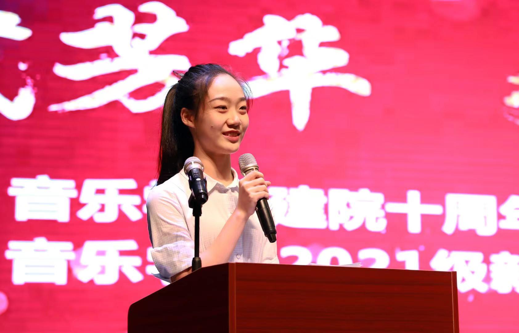 建院十周年之际,面对新环境和新起点,她代表2021级全体同学向学院做出庄严承诺,秉承“弘毅、博学、求真、至善”的校训和“音和乐谐、德艺双馨”的院训,在四年的大学生活中立德修身,求知学艺,遵章守纪,不断自我塑造、自我提升、自我成就,让人生变得更加精彩。