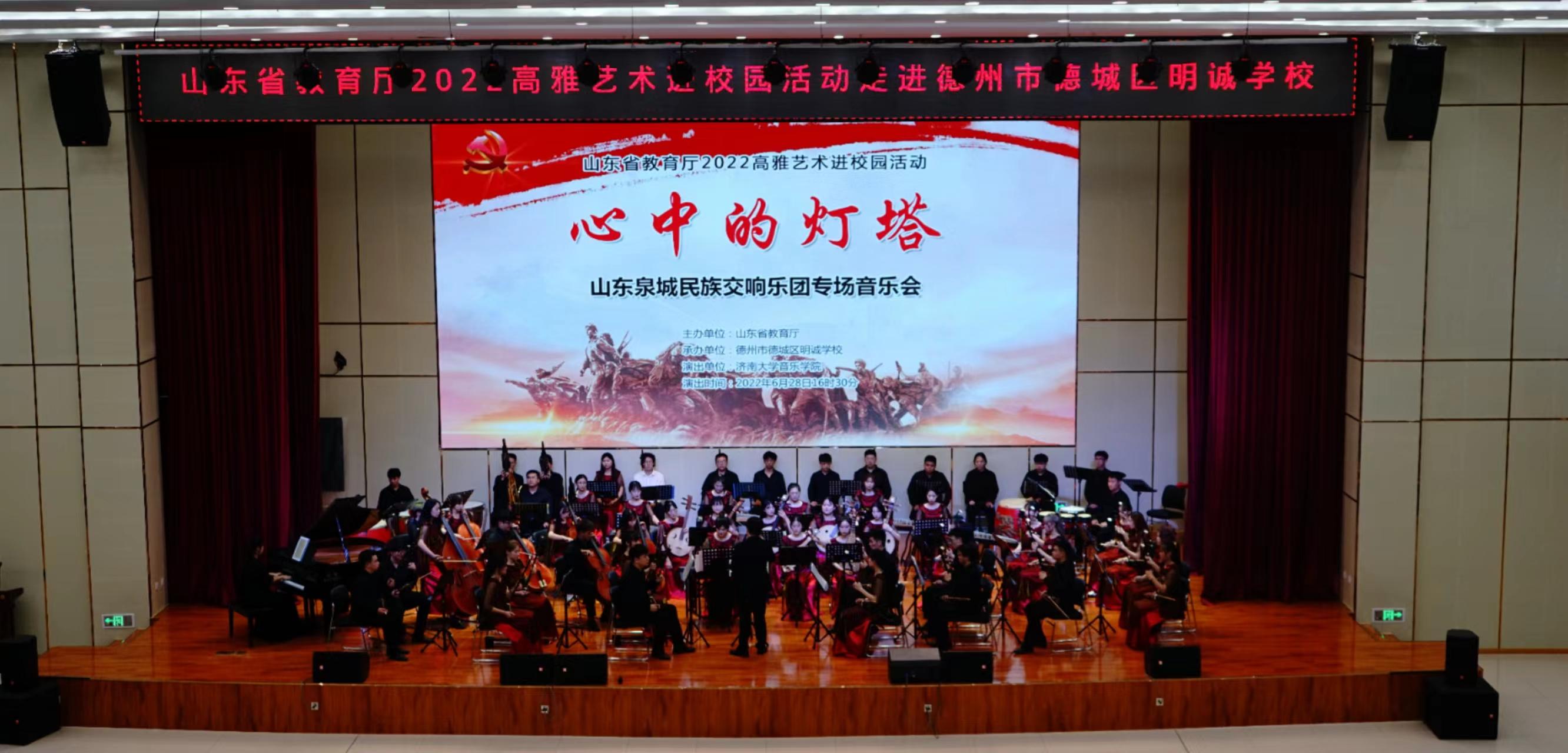民族管弦乐作品《心中的灯塔》由音乐理论系王晓锋老师创作,以歌曲《跟着共产党走》为素材,诗篇般描述了历史过往,展现了在党的领导下,中国人民奋勇前进、不畏艰险的民族气概,表达了“听党话、感党恩、跟党走”的铮铮誓言。由田浩老师改编的《孤勇者》,受到了台下学生们的追捧,大家跟着指挥大声合唱,极大地拉近了中小学生与传统民乐的距离。本次演出受到大众网、牡丹融媒等多家媒体报道。