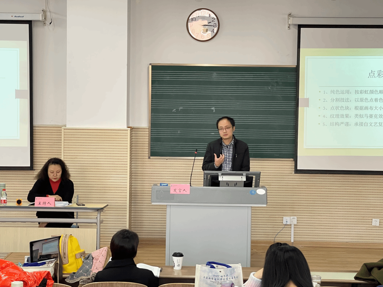 教师卞兆裕作了主题发言,他在“西方音乐作曲家与作品研究”之“西方现当代音乐”这一子课题下,以奥地利作曲家韦伯恩的点描技法与新印象派画家的点彩技法为主题进行比较分析。卞兆裕老师认为,点描技法和美术技法一样,都是以点状色块为主进行搭配;点与点之间通过严谨的逻辑列在一起,二者都能在听觉和视觉上产生立体感;音乐通过分布在不同区的乐器和听觉响应时间来产生立体感,美术则通过与画作的距离、视网膜的调节以及作品本身的透视结构等因素来产生立体感,二者都对传统元素进行了保留与发展,并在其艺术领域内产生了深远的影响。卞老师的观点新颖,视角独特,结合具体事例进行条分缕析,引起了与会学者的兴趣和良好反响。