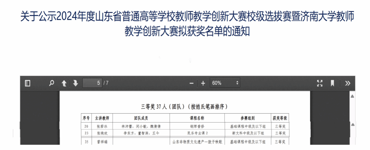 青年教师张若冰、张晓玫、曾祥瑞及其团队主持的《钢琴普修》、《民乐专业课2》及《山东非物质文化遗产——鼓子秧歌》均在此次比赛中获奖。