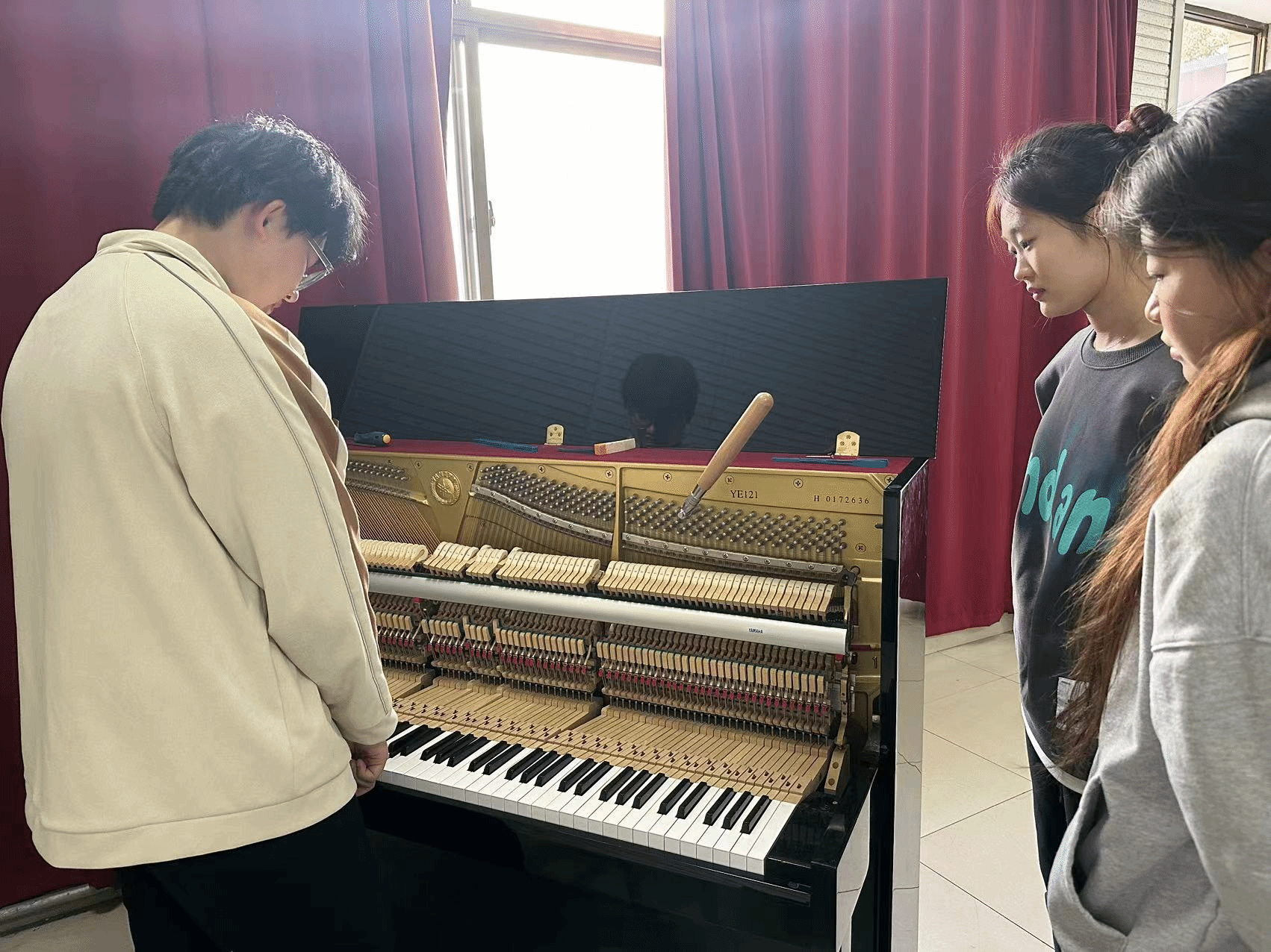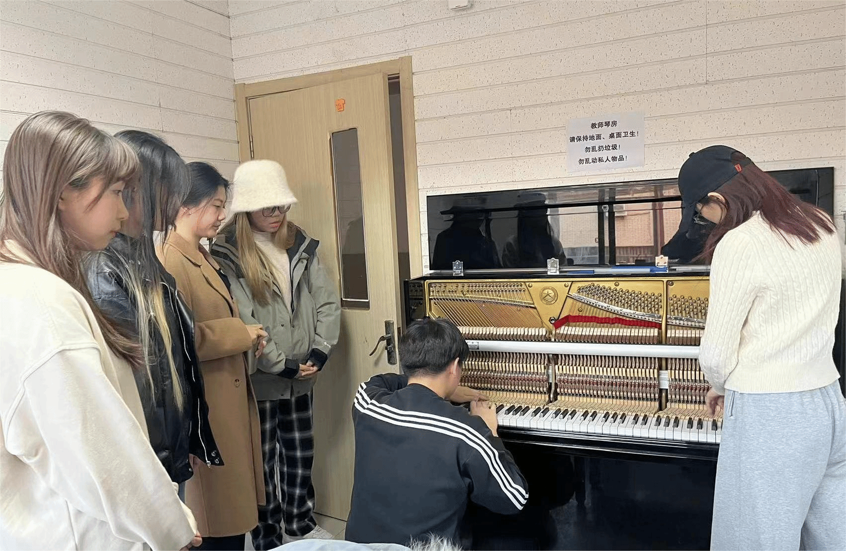 艺术实践周正值学校供暖1个月,是钢琴调律的最佳时间,学生利用所学理论知识和实操技术,在教师的指导下,分组对多媒体教室、研讨课教室、排练厅及琴房进行维修调整与调律,通过实践同时检验学生学习成果。