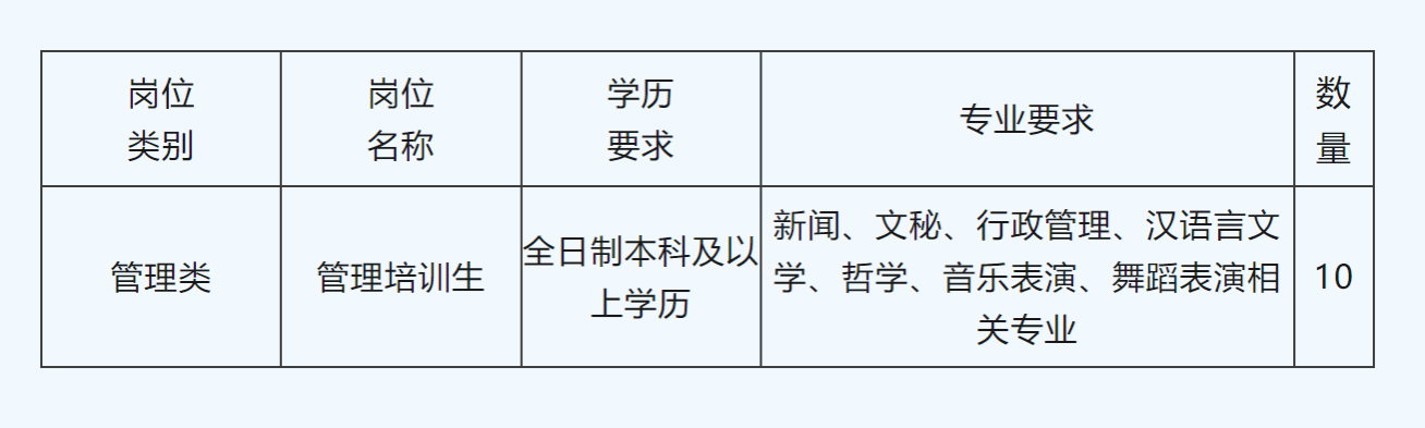 招聘要求全日制本科及以上学历,新闻、文秘、行政管理、汉语言文学、哲学、音乐表演、舞蹈表演等相关专业,或具有一定相关工作经验。