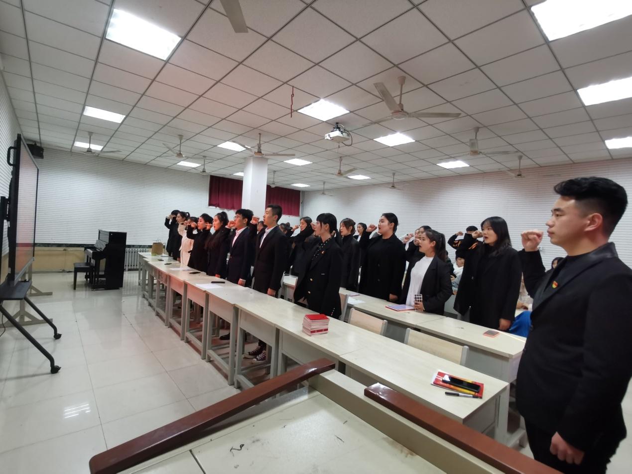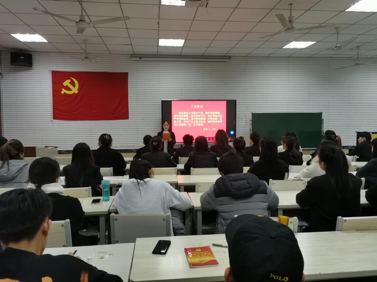 在第二多媒体教室举行新发展预备党员入党宣誓仪式,学院新发展的预备党员师生29人参加宣誓,仪式由学生第一党支部书记马媛主持。