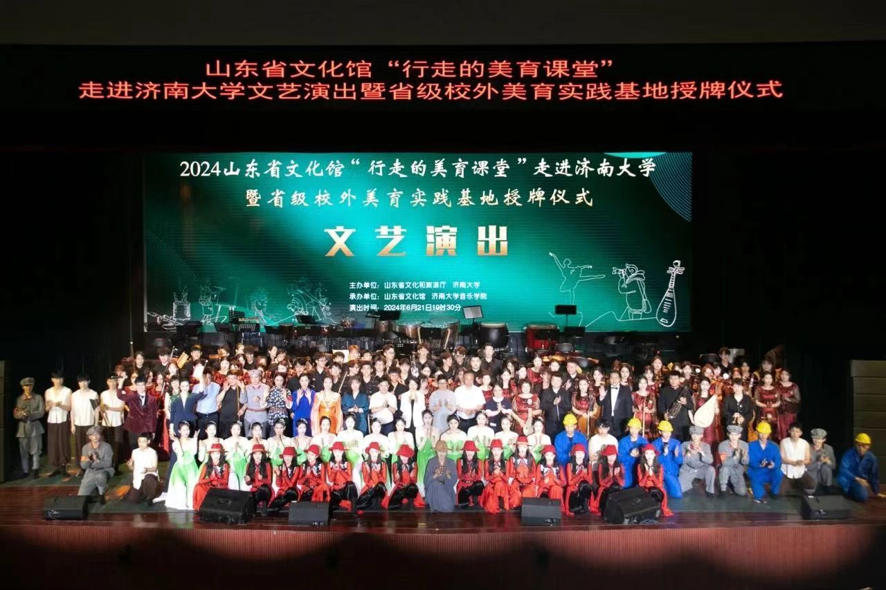 历来重视美育教育,坚持内涵、特色、创新、开放的发展原则,加强艺术类学科建设,培养高素质艺术人才,组建高水平艺术团体,创排优秀艺术作品,创新教育载体,通过参演各类重大活动以及日常艺术实践,打造“沉浸式”大思政课堂,切实提升育人成效。此次“山东省文化馆省级校外美育实践基地”挂牌,标志着双方将携手合作,共同打造一个全新的美育教育平台。未来双方将以此为契机进一步加强合作,院馆携手建立美育协同机制,招募社会文艺志愿者,开发校外美育实践特色课程,共享共建育人新模式,把“行走的美育课堂”打造成以美育人、以美化人、以美培元的生动载体与平台,共同推动美育事业的繁荣发展,为培养更多具有高尚审美情操和深厚文化素养的优秀人才贡献力量。